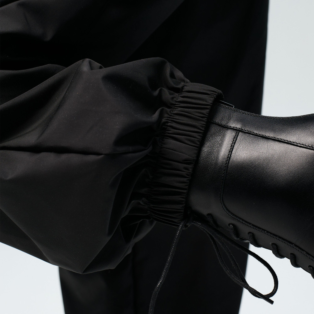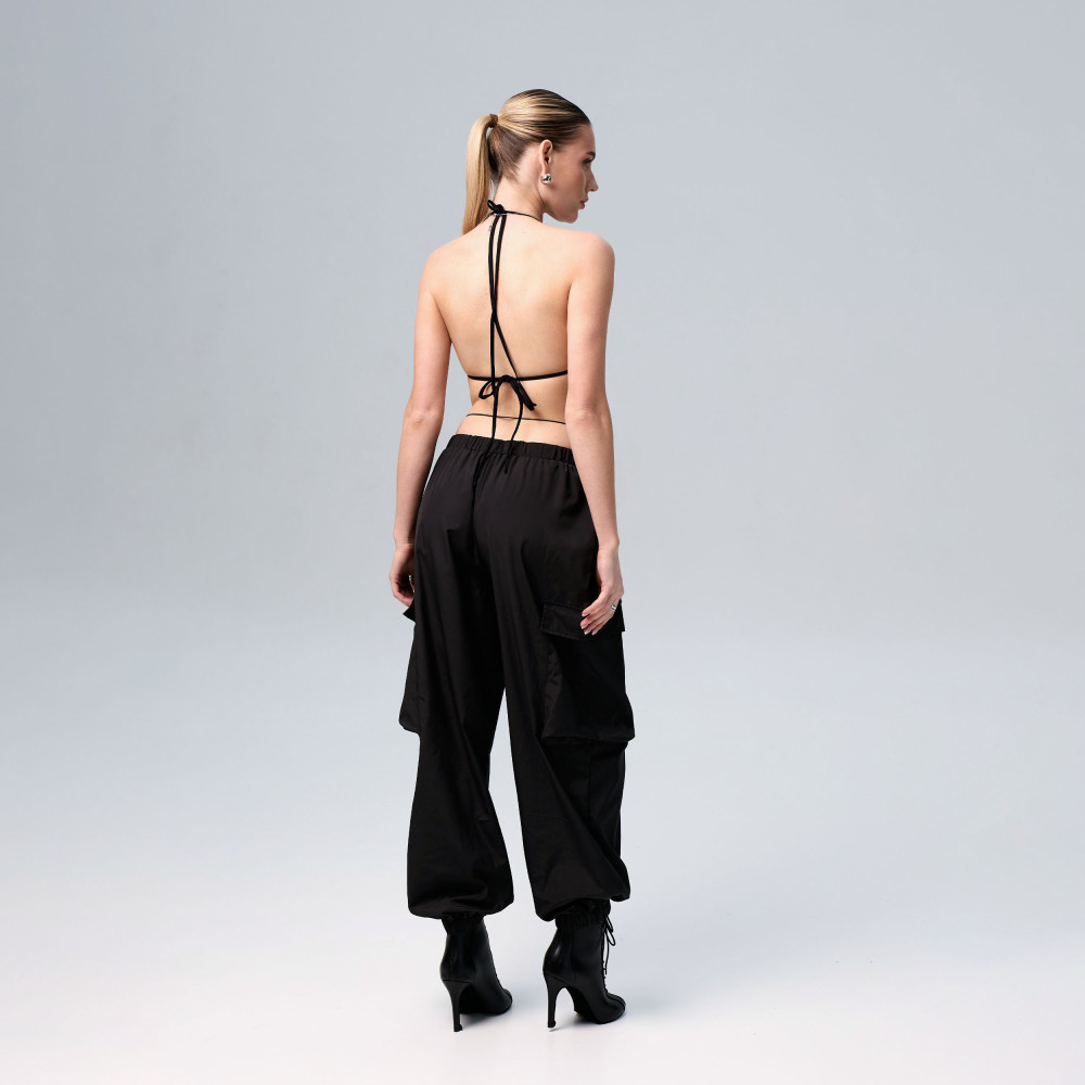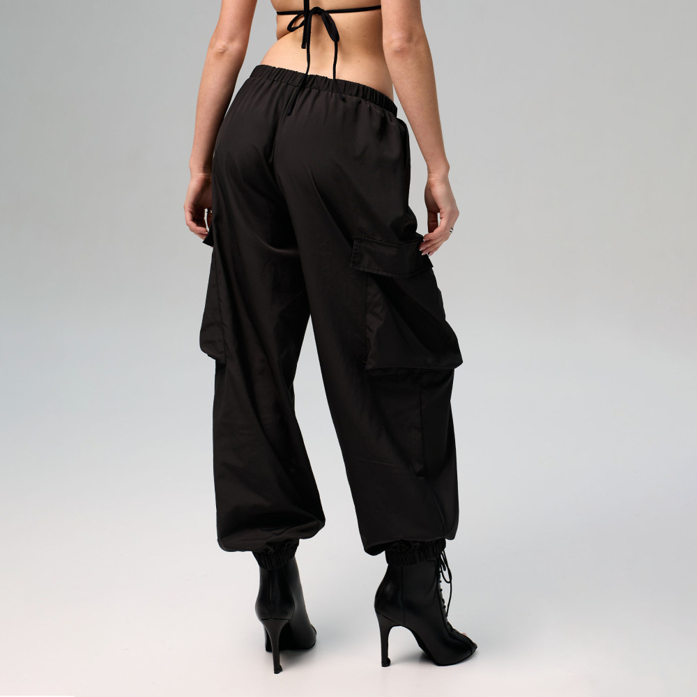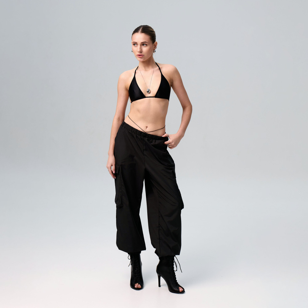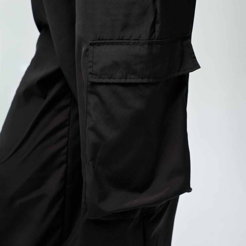 Black cargo pants are made from lightweight and durable sports fabric with a windbreaker-style texture. The material provides comfort and freedom of movement during training and dance. It is wear-resistant and keeps its shape well, making the pants suitable for intensive training and active choreography. The relaxed fit and functional pockets make the design practical and comfortable.