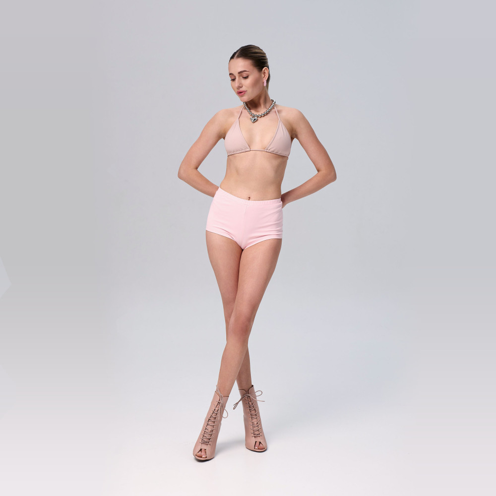 Pink boxer shorts are made from smooth, elastic sports fabric that comfortably fits the body and does not restrict movement. The material combines the strength of nylon with the elasticity of spandex, allowing the shorts to stretch well and maintain their shape during active training and dance. The mid-rise waist provides a comfortable and secure fit during movement.